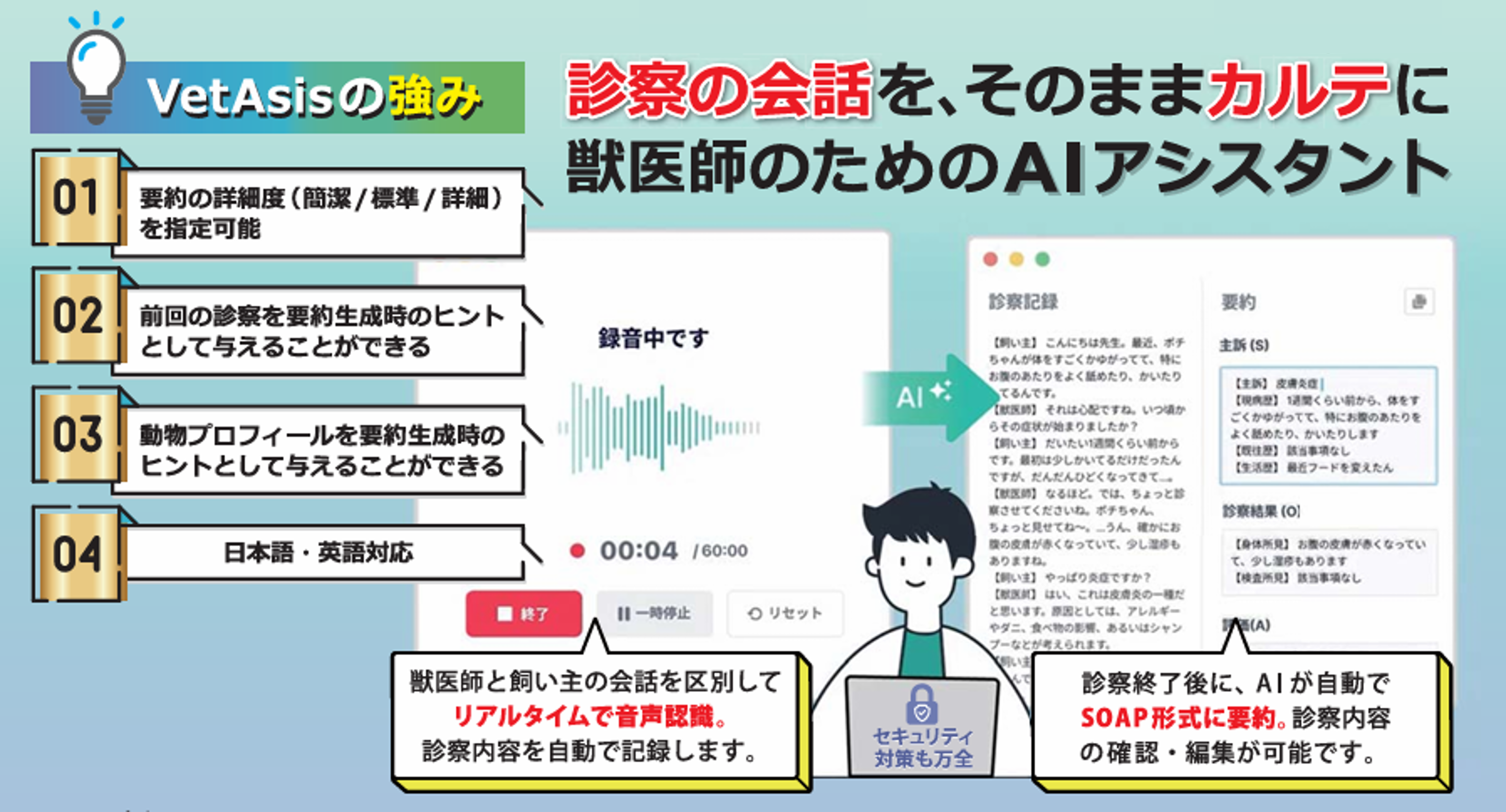 診察中の獣医師と飼い主の会話を AI が書き起こし、 SOAP 形式に自動要約。